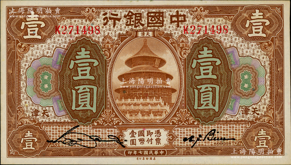 民国七年(1918年)中国银行棕色壹圆,天津地名,宋汉章·卞寿孙签名,原票九八成新