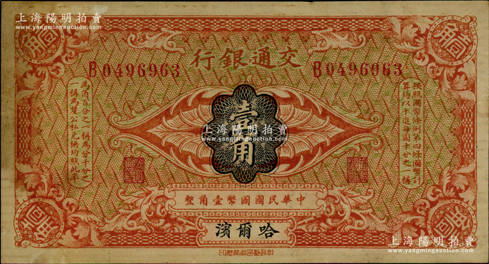 交通银行(1914年)壹角,哈尔滨地名,单字轨,曹汝霖·陈福颐签名;海外回流品,未折近九成新