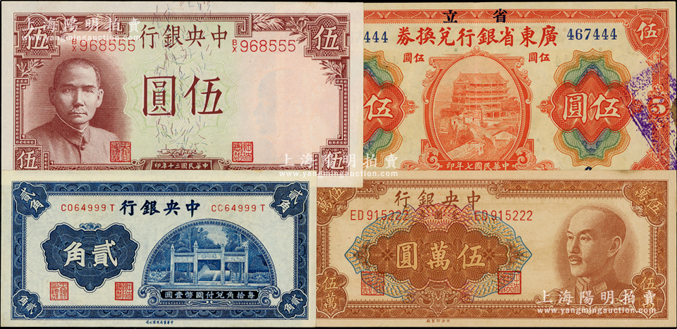 民国纸币豹子号4种,详分:中央银行中华版洙水桥贰角(尾号999)、1941年德纳罗版岳阳楼伍圆(尾号555)、金圆券1949年中央厂棕色伍万图(尾号222);省立广东省银行兑换券1918年伍圆(尾号444);九至九八成新,敬请预览