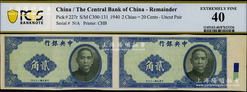 民国二十九年(1940年)中央银行中华版贰角共2张联体,属无职章、号码之半成品券,近九成新