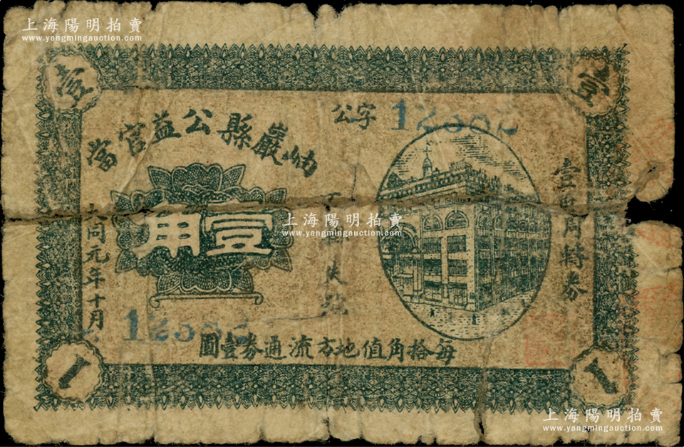 大同元年(1932年)岫岩县公益官当壹角,此种大同年号之典当业私帖存世极为罕见;日本藏家出品,近七成新