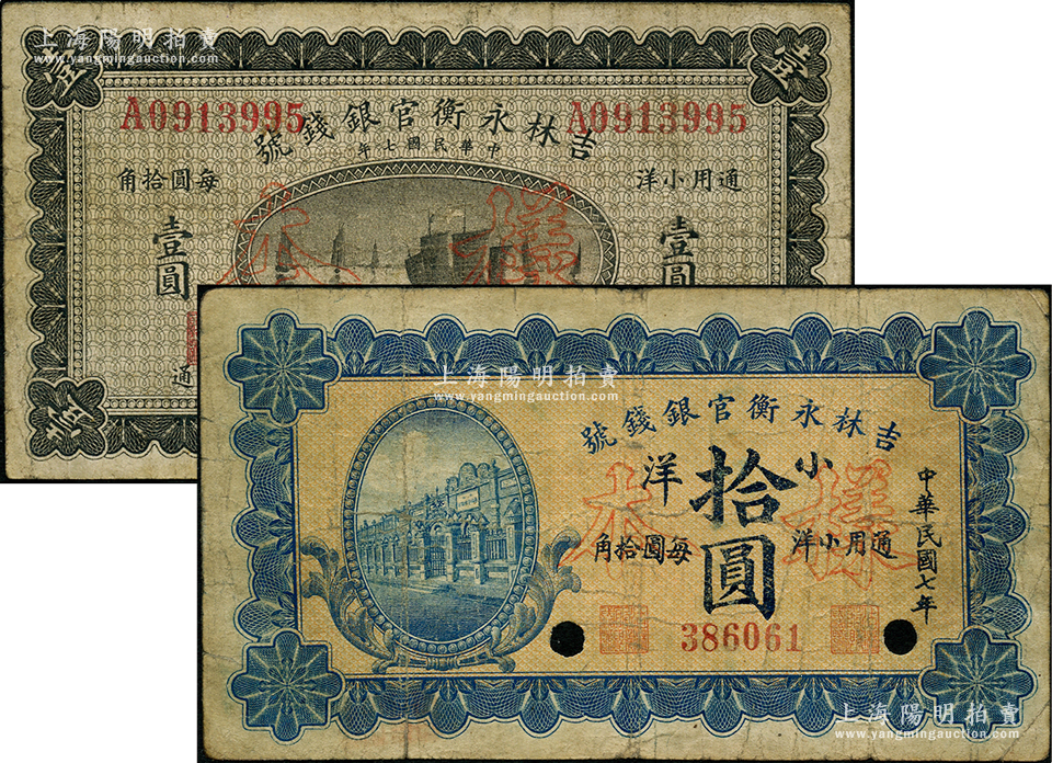民国七年(1918年)吉林永衡官银钱号通用小洋壹圆、拾圆共2枚不同,均为正票改作样本,七成新