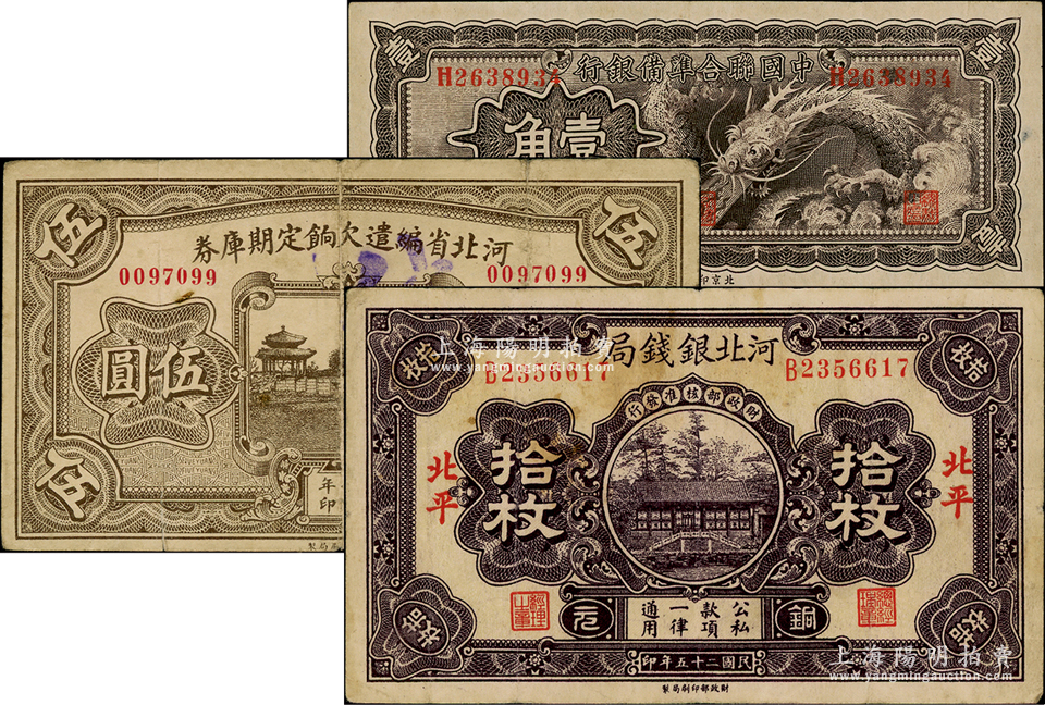 民国纸币3种,详分:河北省编遣欠饷定期库券1929年伍圆;河北银钱局1936年北平拾枚;中国联合准备银行1938年小龙壹角;日本回流品,七至八成新