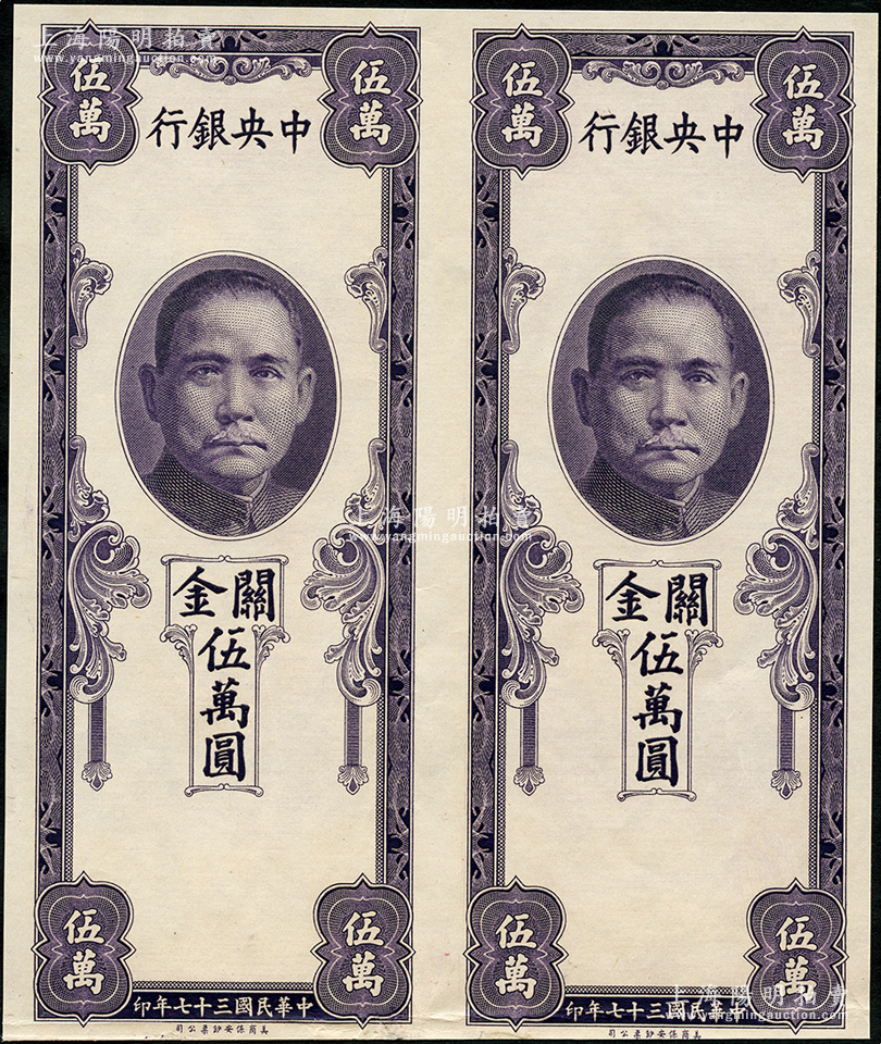 民国三十七年(1948年)中央银行关金保安版伍万圆共2枚联体,属单面未正式发行之试印票,少见,九成新