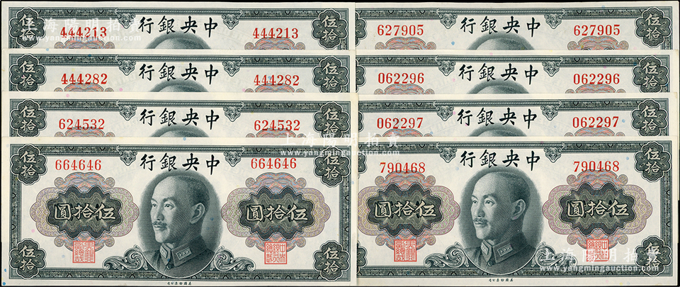1945年中央银行金圆券蒋像伍拾圆共8枚,均为无字轨,九至九八成新,敬请预览