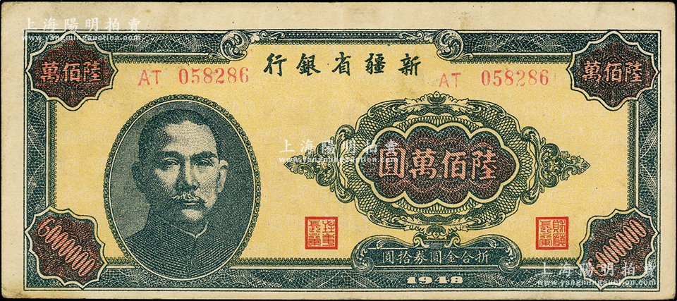 1948年新疆省银行陆佰万圆,品相甚佳,九成新