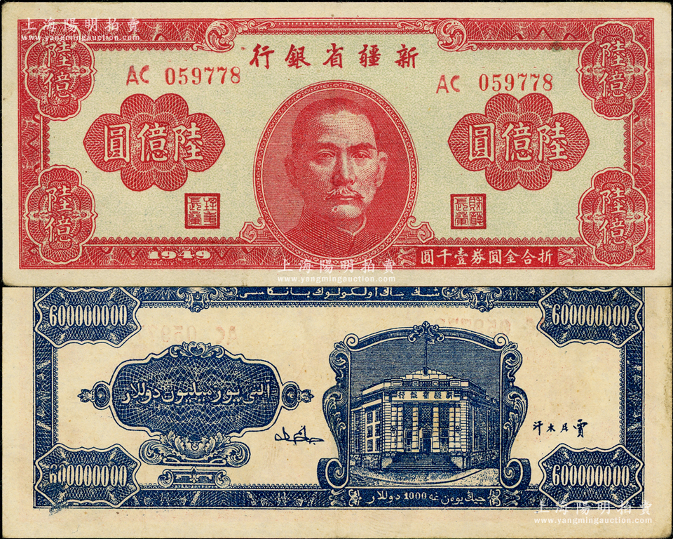 1949年新疆省银行陆亿圆,品相甚佳,纸质硬挺,八五成新