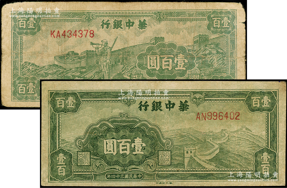 民国三十四年(1945年)华中银行绿色长城图壹百圆、绿色长城吹号图壹百圆共2枚不同,均属大号码券,其中1枚有修补,七成新,敬请预览