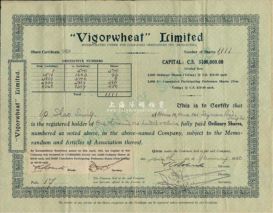 1940年强身麦品有限公司股票(英文版),面额1111股(每股10元),该公司注册于香港,股票发行于上海,八成新