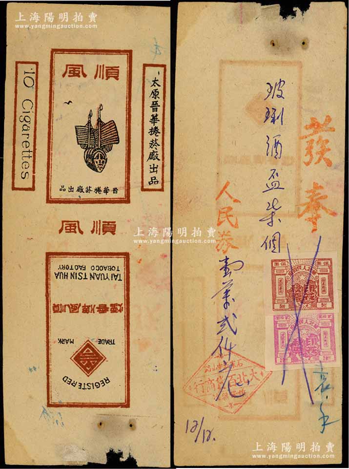 民国时期太原晋华捲菸厂“顺风牌香烟”烟标1枚,背面已改作发票使用,且贴有华北人民政府伍圆和贰拾圆印花税票共2枚,保存尚佳,敬请预览