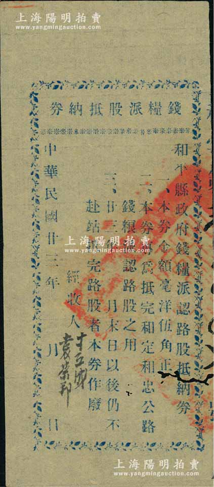 民国廿三年(1934年)和平县政府钱粮派认路股抵纳券毫洋伍角,专为抵完和定、和忠公路钱粮派认路股之用(即和平县至定南县、连平县忠信镇公路),属广东省罕见之公路股票,七五成新