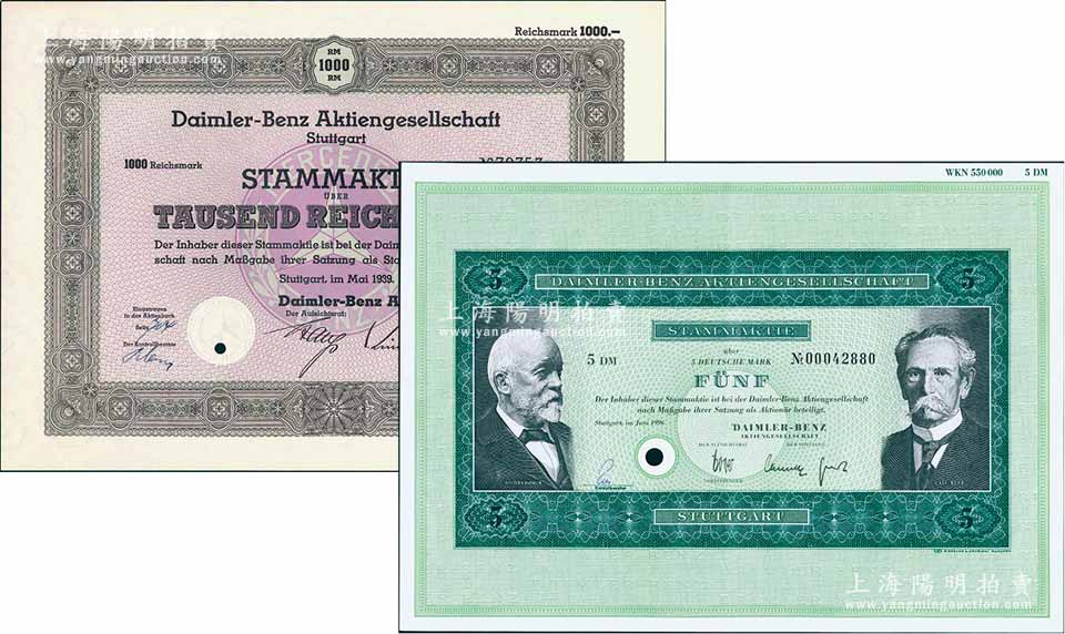 (德国)奔驰汽车公司(全称“戴姆勒-奔驰汽车公司”)股票共2种,详分:1939年1000马克,上印奔驰汽车“三叉星”标志;1996年1股计5马克,上印该公司两大创始人像;该公司为世界商用汽车的最大跨国制造企业,素以生产优质高价的奔驰轿车著称于世;德国藏家出品,少见且均有满版水印,九五成新