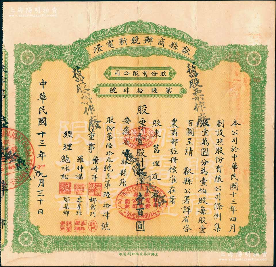 民国十三年(1924年)歙县商办競新电灯股份有限公司股票,壹股计银洋壹百圆(注:该公司股本100万元,此股票发行量不到100张),八成新