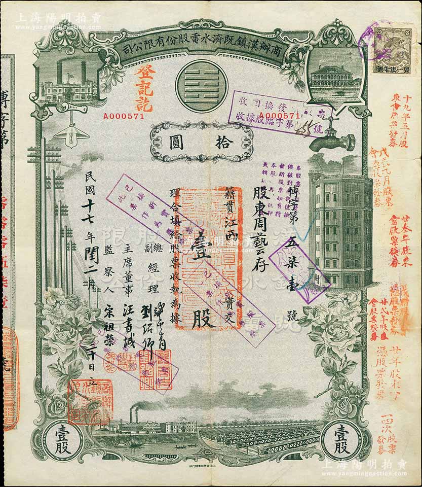 民国十七年(1928年)商办汉镇既济水电股份有限公司股票,灰绿色壹股计国币拾圆,票上由总副经理龚云青、刘绍仰、主席董事汪书城(曾湖北省政府委员兼民政厅长)、监察人宋祖荣签名;该公司为中国近代著名之民族企业,此种图案股票之第一版签名券;该股票乃收回换发股票,少见,八成新