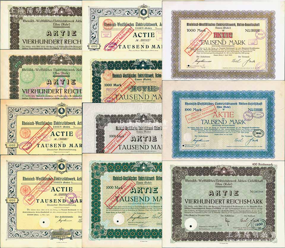 清代至民国时期(世界500强名企)德国莱茵集团股票共11种不同,详分:1903年1000马克,1906年1000马克,1910年1000马克,1913年1000马克,1920年4月棕黄色1000马克,1920年7月蓝绿色1000马克,1921年1000马克,1922年1000马克,1924年400马克,1927年400马克,1929年400马克,其中前3枚清代年份版存世极为罕见,有8枚尺寸超大,均由德国印钞厂印制,后7枚内有水印;德国藏家出品,能收集如此丰富者极为不易,堪称难得佳品,八至九成新