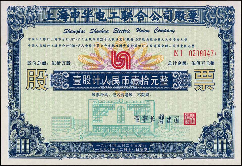 1990年上海申华电工联合公司股票,壹股计人民币壹拾元,属改革开放初期之老股票,九八成新