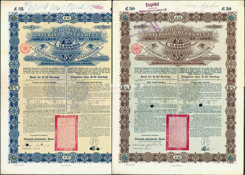 1896年大清中华帝国政府英德借款金债券25镑、50镑共2枚不同,由德华银行(Deutsch-Asiatische Bank)代理发行,驻德公使许景澄签章,满版水印,八成新