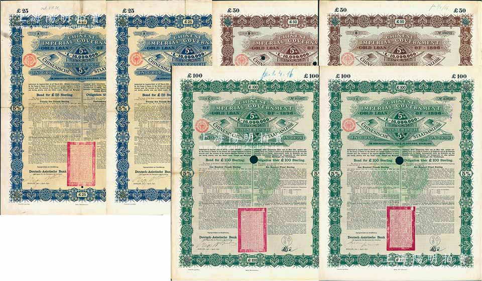 1896年大清中华帝国政府英德借款金债券25镑、50镑、100镑共2套,合计共6枚,由德华银行(Deutsch-Asiatische Bank)代理发行,驻德公使许景澄签章,满版水印;源于德国财政部档案,八至八五成新