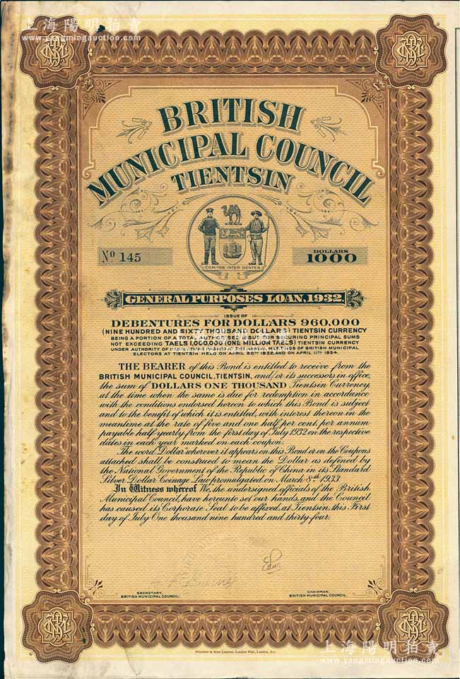 1932年天津大英工部局市政债券1000元,上印有工部局标志,附带有息票,少见,八成新