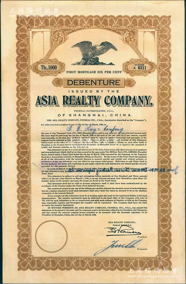 1930年(上海)亚细亚地产公司债券1000两,该公司又名“美商普益地产公司”,此券未加盖日军改值戳记,八五成新