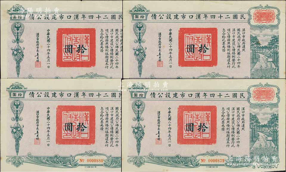 民国二十四年汉口市建设公债拾圆共4枚,由汉口市市长吴国桢签名,八成新