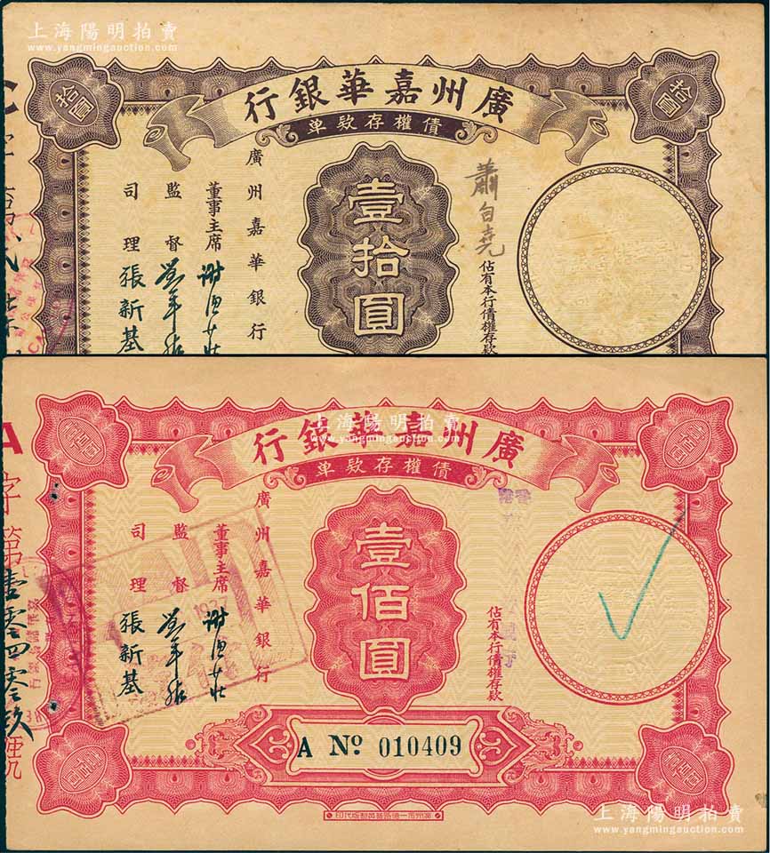民国时期·广州嘉华银行债权存款单壹拾圆、壹佰圆共2枚不同,发行于1935年代香港银行业挤兑风潮之际,至1937年偿还清讫;该行乃中信嘉华银行(2010年又更名为中信银行)之前身,历史意义厚重;源于著名纸币藏家出品,其中拾圆券存世少见,八成新