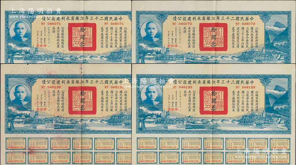 中华民国二十三年江苏省水利建设公债拾圆共4枚,由江苏省主席陈果夫等签名,均附带有息票,八五成新