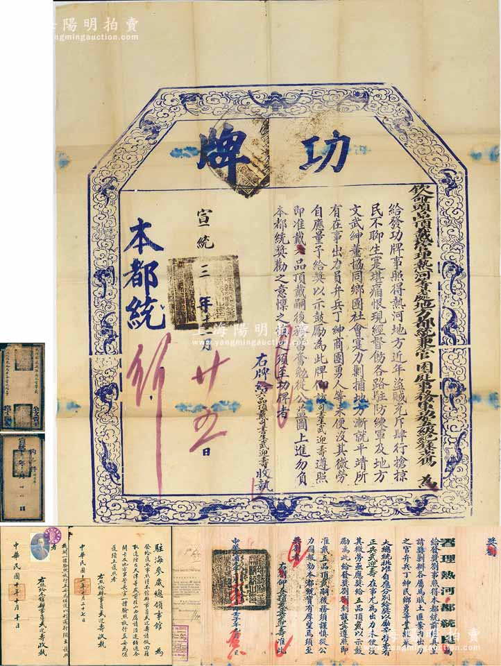 清代至民国时期山西籍“武迎寿”氏遗存之文献一宗共5件,详分:①宣统三年(1911年)“钦命头品顶戴管理热河等处地方都统兼管园庭事务军功加五级纪录十次锡(良)”印发之“功牌”一张,赏给剿捕盗贼在事出力之司书生武迎寿氏“六品顶戴”,其尺寸巨大,约640×790mm,且形制美观;②宣统三年“热河都辕亲军卫队管带张”赉至“热河巡防东路马步各营统领李”之公文官封1个;③民国元年(1912年)“署理热河都统崑(源)”印发之“奖劄”一份,经大总统批准颁给剿办各属马贼、土匪案内出力者正兵武迎寿氏“五品顶戴”(时民国刚立,仍沿用清代体例者“奖劄”极为罕见);④1921年和1923年“驻海参崴总领事馆”护照共2份,分别发给本馆办事员武迎寿“由北京来崴就职”和“请假回籍”等情;此乃同一人之历史文献,能保存如此完整者殊为难得,值得珍视和推重,保存甚佳,敬请预览