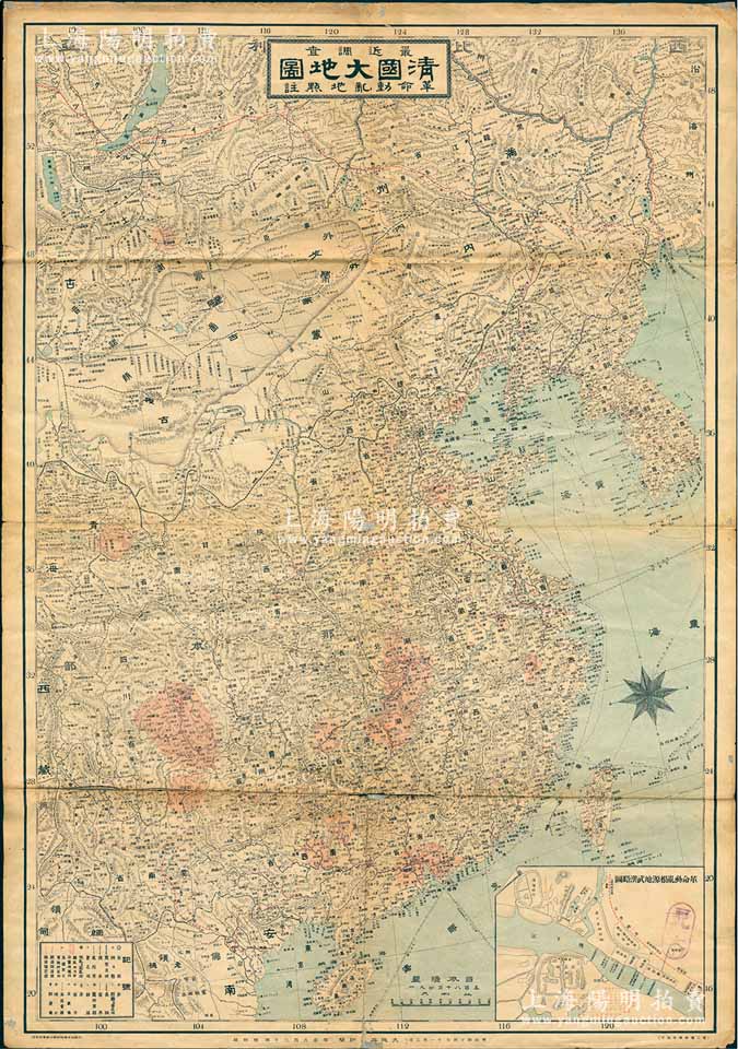 明治四十四年(1911年)《最新调查清国大地图·革命动乱地点注》大型地图1张,尺寸540×770mm,内中以红色标注各地革命党根据地等情,乃属辛亥革命之地图文献;刘文和先生藏品,保存尚佳,敬请预览