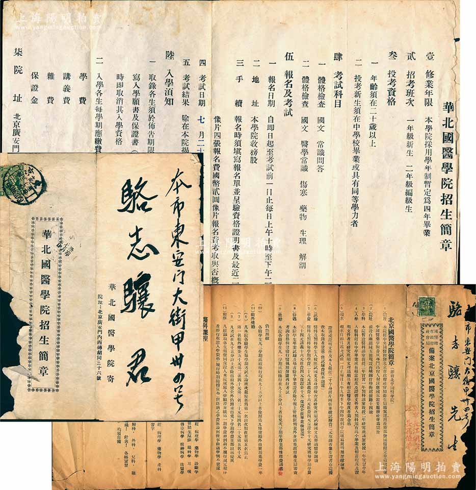 民国时期“北京国医学院招生简章”(址设西城锦什坊,董事长为著名北洋政要江朝宗氏)、“华北国医学院招生简章”(址设广安门内西砖胡同)共2份不同,均属实寄之邮简;源于京城前辈名家骆泽民先生之遗存,保存尚可,敬请预览