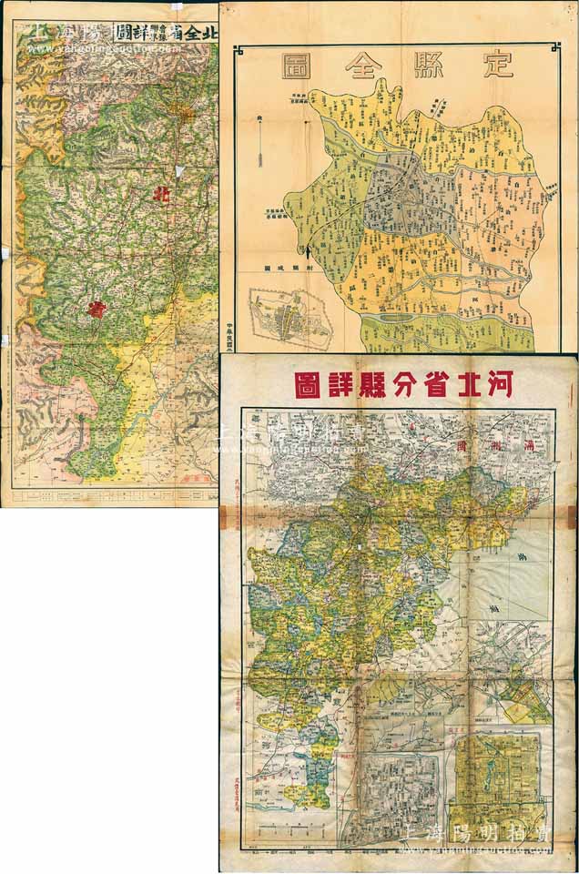 河北省老地图共4张不同,详分:①最新地学社发行《河北全省鲁豫联界详图》;②1943年《河北省分县详图》;③1931年定县建设局製《定县全图》;④1959年《石家庄市游览图》;源于京城前辈名家骆泽民先生之遗存,有裂痕或贴痕,敬请预览