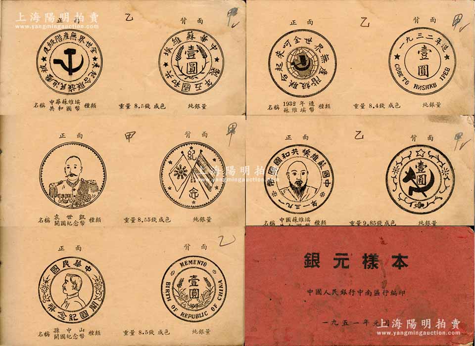 1951年元月中国人民银行中南区行编印《银元样本》一册,专供各行收兑银元分版参考之用,内中收录苏维埃银币、军阀纪念币、民国流通银币、龙洋、外国银币图片共50页,颇具参考价值,保存尚佳,敬请预览