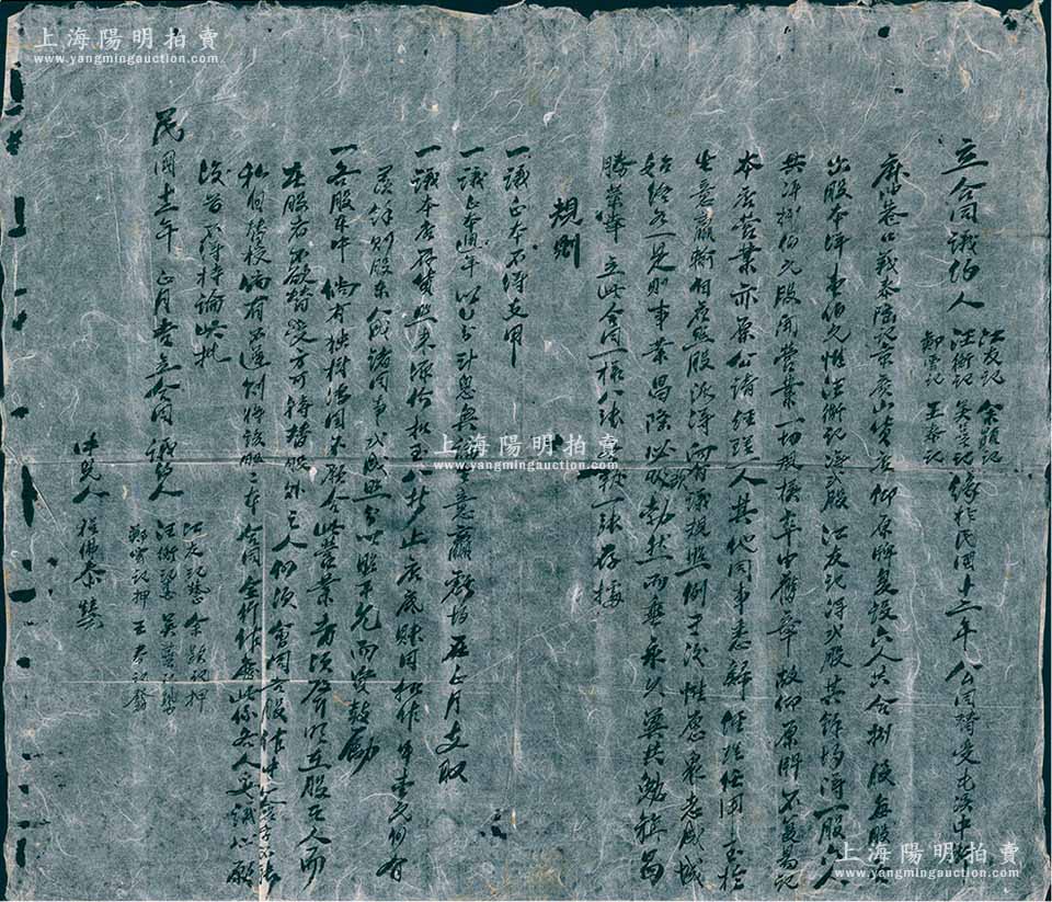 民国十二年(1923年)安徽屯溪“义泰隆”合约一份,事为“江友记、汪衡记、郑云记、王泰记等6人公同替受屯溪中街义泰隆记京广山货店,仰原牌复设六人,共合捌股,每股各出股本洋壹佰元,惟汪衡记、江友记各得贰股,其余均得一股,六人共洋捌佰元,内中详列公议规则等情;此种传统合同式老股票,内涵丰富,保存尚佳,敬请预览
