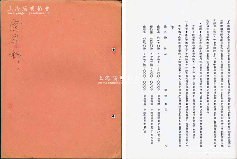 1951年“广昇祥”合夥议据1册,内中记录有该公司之资本人民币6.16亿元、各股东份额及公议条款等详情,文字内容极富内涵;该号始创于清道光三十年(1850年),以销售袜子、内衣等针织品及日用品百货为业务,乃属上海南京路老字号;保存甚佳,敬请预览