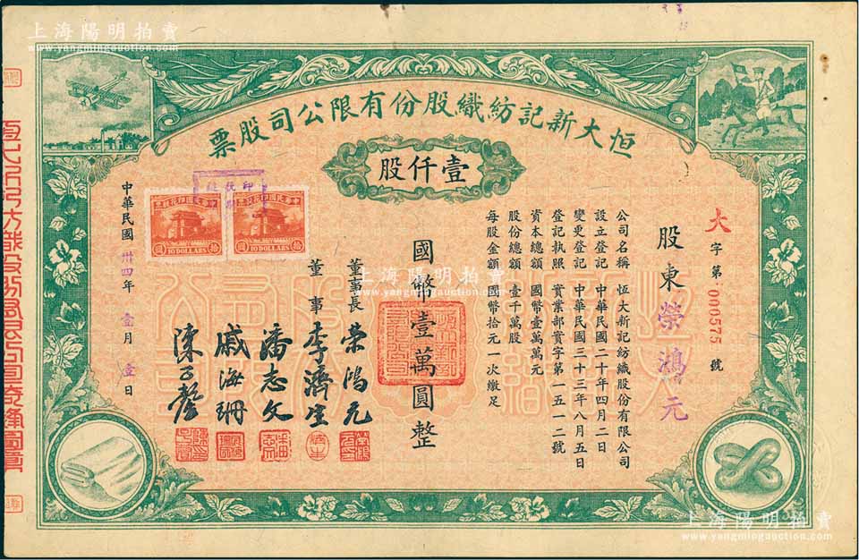 民国卅四年(1945年)恒大新记纺织股份有限公司股票,绿色壹仟股计国币壹万圆,票上四角图案极富特色,其承购股东即为该公司董事长荣鸿元氏;八五成新