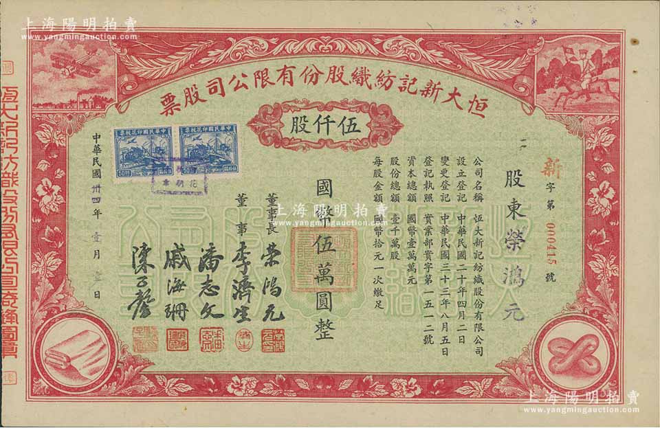民国卅四年(1945年)恒大新记纺织股份有限公司股票,红色伍仟股计国币伍万圆,票上四角图案极富特色,其承购股东即为该公司董事长荣鸿元氏;九成新