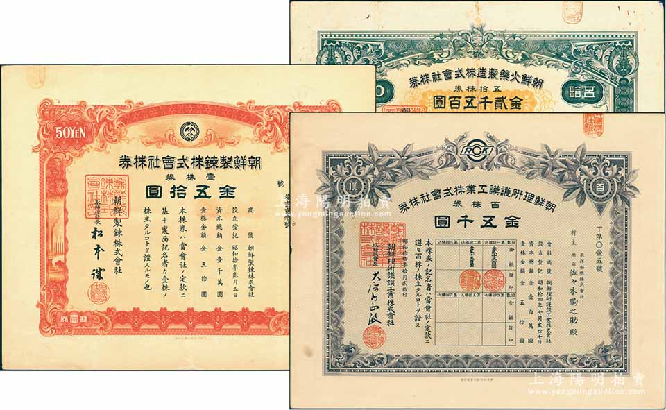 朝鲜老股票3种,详分:1935年朝鲜制炼株式会社株券,壹株券金五拾圆;1939年朝鲜理研护谟工业株式会社株券,百株券金五千圆;1942年朝鲜火药制造株式会社株券,五拾株券金贰千五百圆;少见,七至八五成新