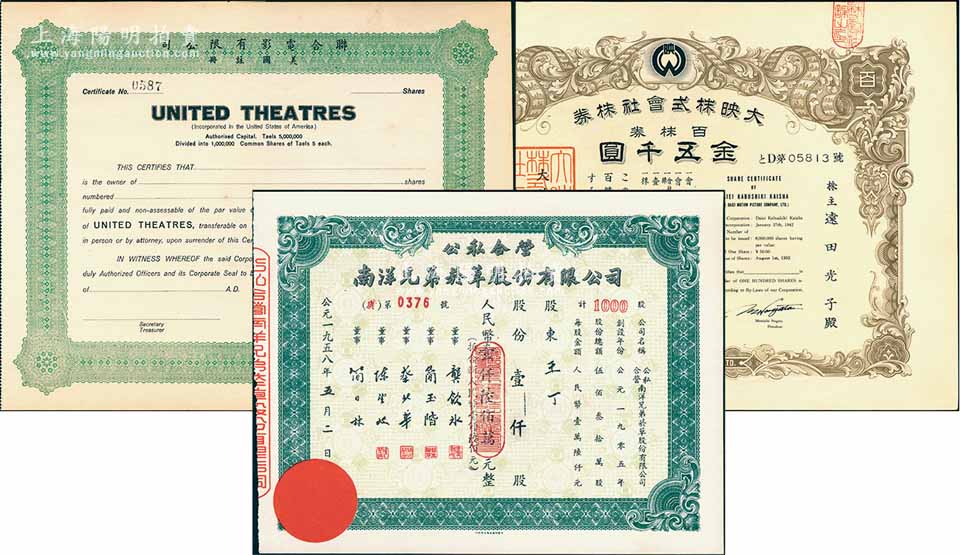 老股票3种,详分:(上海)联合电影有限公司(美国注册)股票,未填用附存根;1954年大映株式会社株券,百株券金五千圆,属日本电影公司;1958年公私合营南洋兄弟烟草公司股票,壹仟股计人民币壹仟陆佰万元;九成新