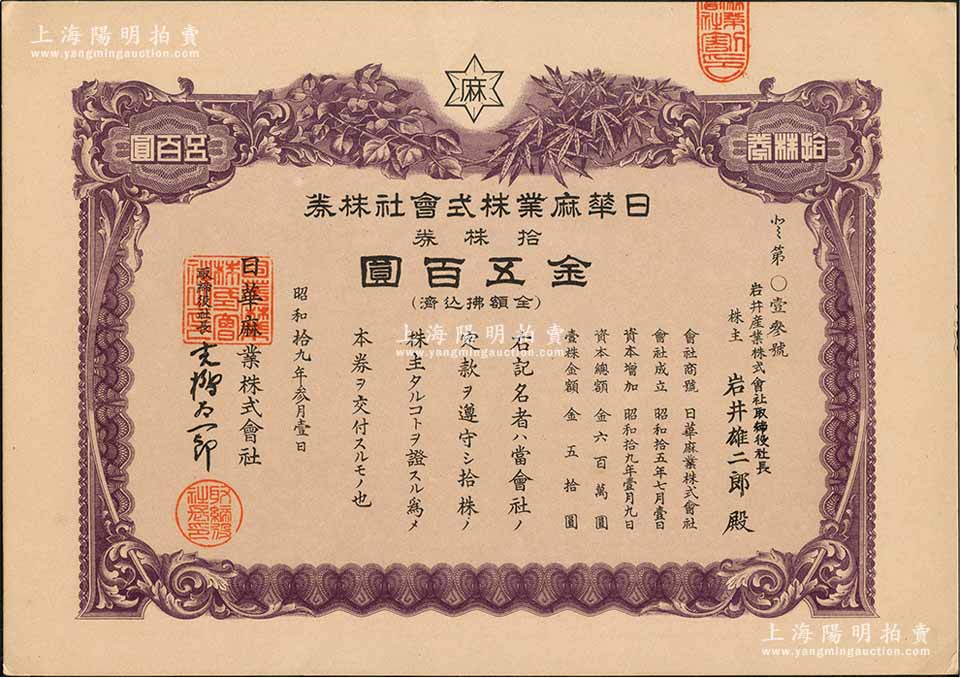 昭和拾九年(1944年)日华麻业株式会社株券,拾株券金五百圆,属日伪统治时期日商在沪企业,成立于1940年,址设上海长寿路,抗战胜利后由国民政府接收,解放后改称上海第一制麻厂;少见,九五成新