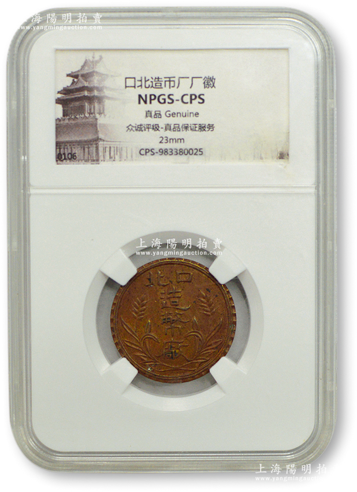 民国时期“口北造币厂”铜质币型章1枚,直径23mm,此(张家口)口北造币厂成立于1923年秋,曾铸造有“中华铜币”铜元,后于1927年停产;品相甚佳,已评级,敬请预览