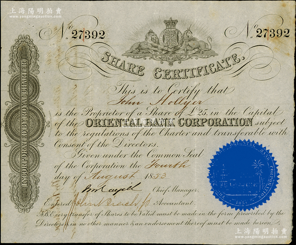 1853年丽如银行(中国第一家外商银行)股票25镑,薄纸版,票上有蓝色火漆印;苏健先生藏品,少见,八五成新