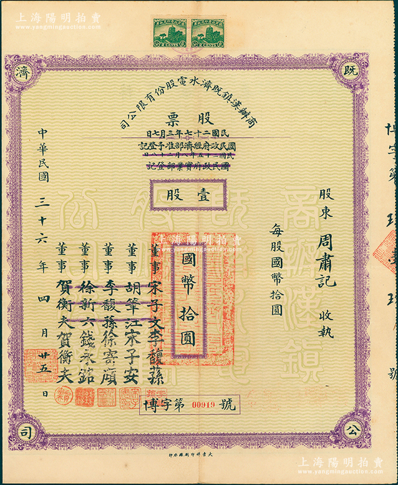 民国三十六年(1947年)商办汉镇既济水电股份有限公司股票,壹股计国币拾圆,票上之董事分别改印为银行家李馥荪、宋子安(宋子文之弟)、徐寄廎、钱永铭和汉口商会会长贺衡夫,附带有完整股息票,乃属中国著名民族工业老股票;苏健先生藏品,少见,八五成新