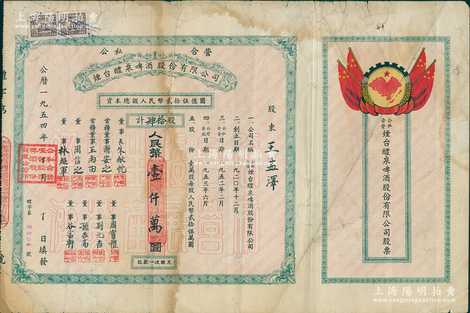 1954年(公私合营)烟台醴泉啤酒股份有限公司股票,肆拾股计人民币壹仟万圆,上印国旗和“全国山河一片红”地图,甚至将琉球、台湾等岛屿均印成红色,十分特殊;苏健先生藏品,少见,七五成新