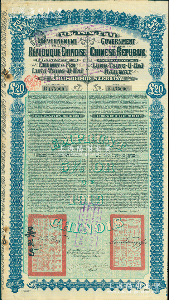 1913年中国政府对外发行督办陇秦豫海铁路公债20英镑,在比利时发行,票上印有驻比公使吴尔昌、陇海路督办施肇曾签名及官印,附带有息票;苏健先生藏品,八成新