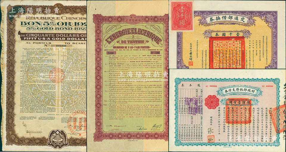 民国债券4种,详分:1923年财政部秋节支付券银圆壹百圆,由财政总长张弧签名;1925年交通部借换券壹仟圆,由交通总长叶恭绰签名;中华民国1925年五厘金券50美元,乃著名“金佛朗案”历史实物;1939年天津法国电灯房债券100元;苏健先生藏品,八至九成新