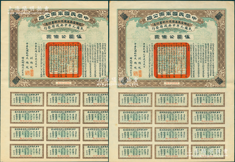 民国元年(1912年)中华民国军需公债伍圆共2枚,为南京临时政府发行,由大总统孙文、副总统黎元洪、财政总长陈锦涛签名,均附带有完整息票,九成新