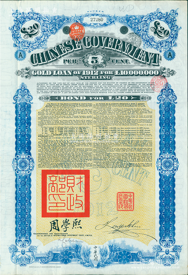 1912年中华民国政府对外发行五厘金镑债券(即克里斯浦借款)20镑,盖有“中华民国驻英代办之印”、驻英公使刘玉麟和北洋政府财政总长周学熙签名,附带有息票,有水印,八五成新