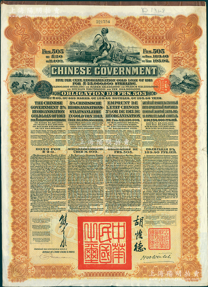 1913年中华民国政府向五国银行团善后大借款公债505法郎,由东方汇理银行(Banque de L'Indo-Chine in Paris)代理发行,棕色印刷,由北洋政府总理兼财政总长熊希龄、驻法公使胡惟德签署,八成新