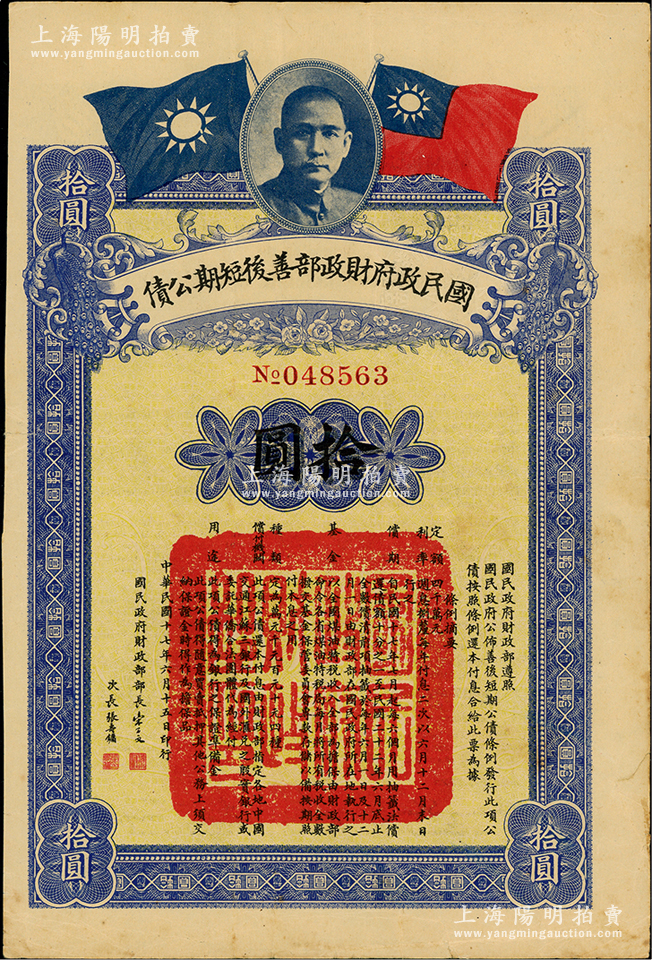 民国十七年(1928年)国民政府财政部善后短期公债拾圆,由财政部部长宋子文、次长张寿镛签署,少见,八成新