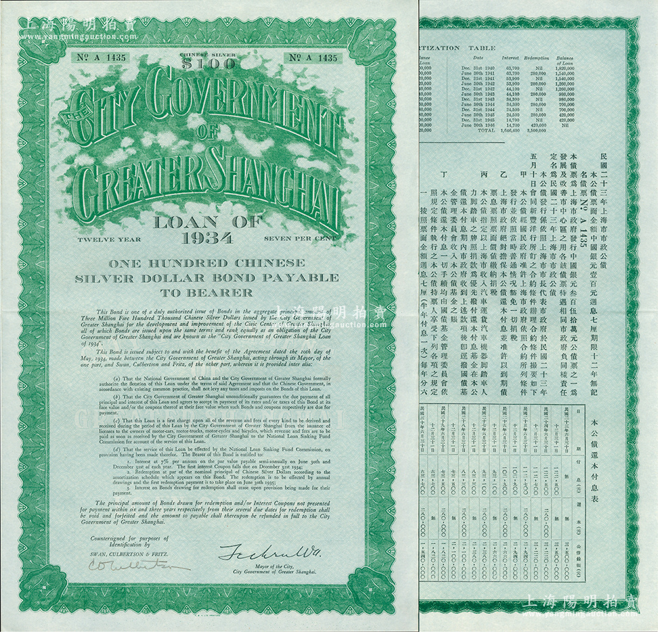 民国二十三年(1934年)上海市市政公债壹百元,正面英文,背面有中文,由上海市市长吴铁城、新丰洋行葛勃生签名,附带有息票;少见,九成新
